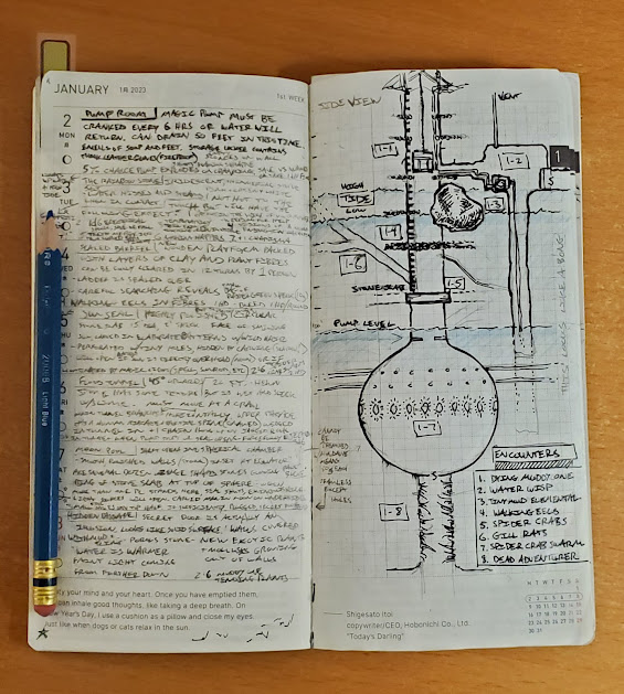 Week 2: Off the beaten path. Secret doors lead to a strange community and more mysteries. More conventional map projection and I've realized I don't have a go-to method for shading/crosshatching a dungeon. No big deal, but something to think about. Do those visual conventions matter? Not for a rough draft, certainly. Reveling in creating multiple paths to different areas and interlinked passages. Water dungeons are fun...to create.